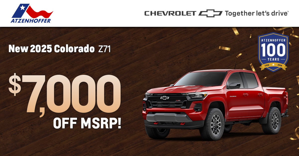 STK#: 1113629 MSRP: $45,570 New 2025 Chevrolet Colorado Z71. Total savings of $7,000 includes $1,000 Chevrolet Consumer Cash, $2,000 Chevrolet Conquest Cash, and $4,000 Dealer Discount. Prices do not include tax, title, license or $250 doc fee. Must trade in qualifying vehicle and take retail delivery by 3/2/2026. Not combinable with other offers; in stock units only. Additional exclusions or limitations may apply. Please see Atzenhoffer Chevrolet for complete offer details, eligibility requirements, and applicable terms and conditions.