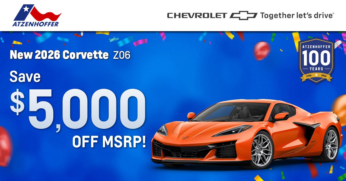 Stock#: 5604597 MSRP: $144,135 New 2026 Chevrolet Corvette Z06 3LZ. Total savings of $5,000 includes $5,000 Dealer Discount, plus $225 doc fee for a total sales price of $139,360. Prices do not include tax, title, and license. Must take retail delivery by 4/30/2026. Not combinable with other offers; in stock units only. Additional exclusions or limitations may apply. Please see Atzenhoffer Chevrolet for complete offer details, eligibility requirements, and applicable terms and conditions.