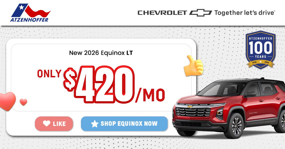 Stock#: L385576 MSRP: $30,795 New 2026 Chevrolet Equinox LT. Payments are calculated at 84 months with $2,000 down payment at 5.9% APR $14.57 per $1,000 financed. With approved credit. Prices do not include tax, title, license or $250 doc fee. Must take retail delivery by 3/31/2026. Not combinable with other offers; in stock units only. Additional exclusions or limitations may apply. Please see Atzenhoffer Chevrolet for complete offer details, eligibility requirements, and applicable terms and conditions.