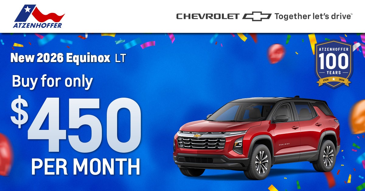 Stock#: L385952 MSRP: $30,795 New 2026 Chevrolet Equinox LT. $450 Payments are calculated at 75 months with $2,000 down payment at 5.9% APR $15.96 per $1,000 financed. With approved credit. Prices do not include tax, title, and license. $225 doc fee included in sales price. Must take retail delivery by 4/30/2026. Not combinable with other offers; in stock units only. Additional exclusions or limitations may apply. Please see Atzenhoffer Chevrolet for complete offer details, eligibility requirements, and applicable terms and conditions.