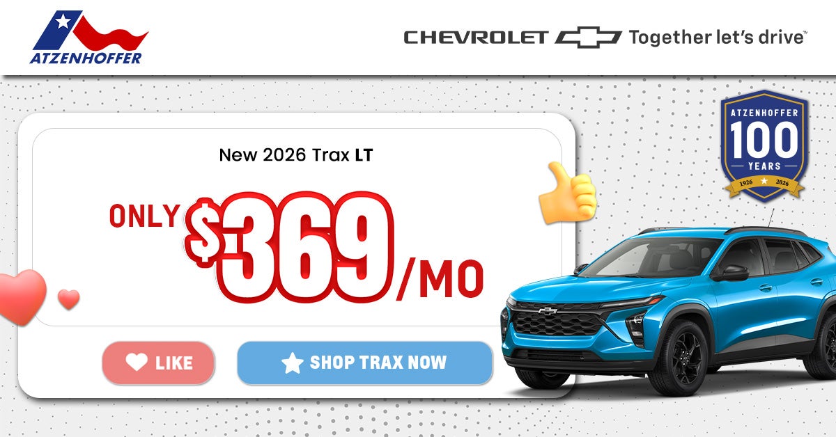 Stock#: C085443 MSRP: $26,385 New 2026 Chevrolet Trax LT. Payments are calculated at 84 months with $1,000 down payment at 5.9% APR $14.57 per $1,000 financed. With approved credit. Prices do not include tax, title, license or $250 doc fee. Must take retail delivery by 3/31/2026. Not combinable with other offers; in stock units only. Additional exclusions or limitations may apply. Please see Atzenhoffer Chevrolet for complete offer details, eligibility requirements, and applicable terms and conditions.