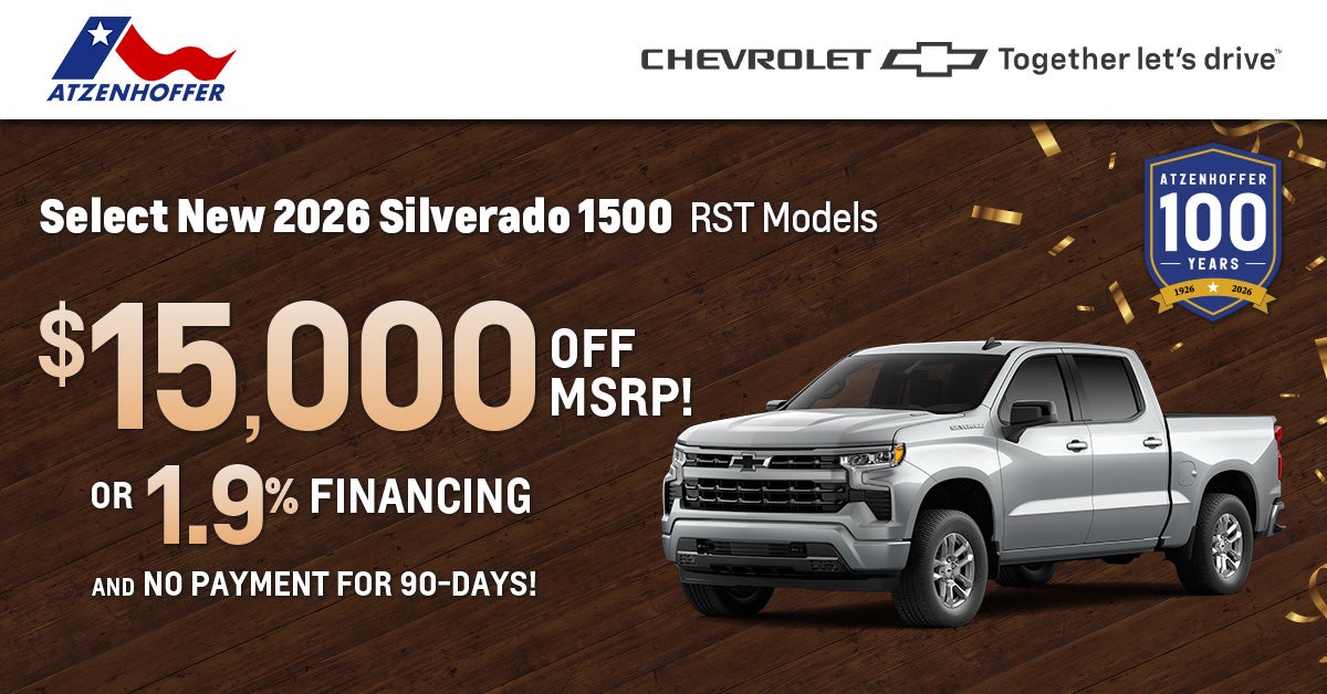 Example STK#: Z180362 New 2026 Silverado 1500 RST Crew Cab with RST Select Package and Turbomax engine. Total Vehicle Price Plus Options: $57,055. Total savings of $15,000 includes $6,350 Factory Option Package Discount for an MSRP of $50,705, minus $3,000 Chevrolet Consumer Cash, $1,000 Chevrolet Select Market Bonus Cash, $1,000 GM Bonus Cash, $1,250 Trade Assistance Bonus Cash, and $2,400 Dealer Discount. Requires customer to trade in a qualifying vehicle. Offer applies to in-stock models only. 1.9% APR available through GM Financial for 36 months with approved credit $28.6 per $1000 financed. Finance charges accrue from date of financing. Prices do not include tax, title, license or $250 doc fee. Take new retail delivery by 3/2/2026. Not combinable with lease offers. Additional exclusions or limitations may apply. Please see Atzenhoffer Chevrolet for complete offer details, eligibility requirements, and applicable terms and conditions.