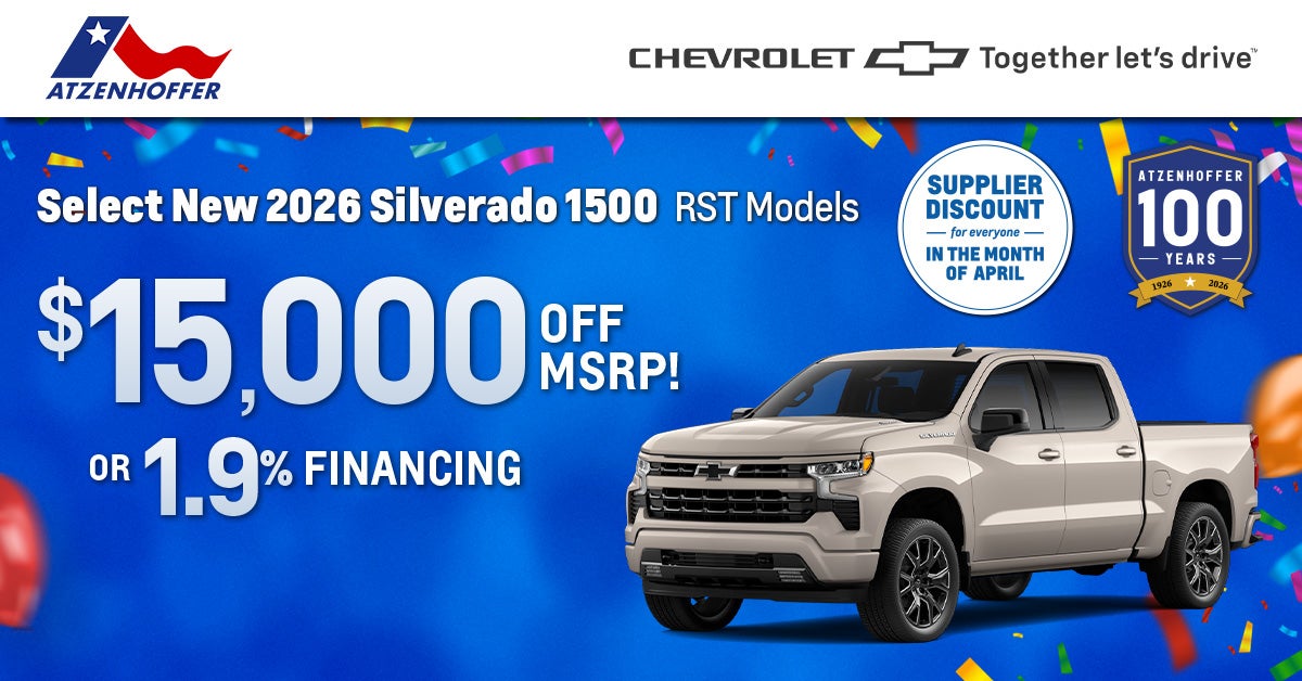 Example Stock#: Z186651 New 2026 Silverado 1500 RST Crew Cab with RST Select Package and Turbomax engine. Total Vehicle Price Plus Options: $57,055. Total savings of $15,000 includes $6,350 Factory Option Package Discount for an MSRP of $50,705, minus $2,000 Chevrolet Consumer Cash, $1,000 Chevrolet Select Market Bonus Cash, $2,439 Supplier Pricing for Everyone, $3,211 Dealer Discount, plus $225 doc fee for a total sales price of $42,280. Offer applies to in-stock models only. 1.9% APR available through GM Financial for 36 months with approved credit $28.6 per $1,000 financed and cannot be combined with all offers. Prices do not include tax, title, and license. Take new retail delivery by 4/30/2026. Not combinable with lease offers. Additional exclusions or limitations may apply. Please see Atzenhoffer Chevrolet for complete offer details, eligibility requirements, and applicable terms and conditions.